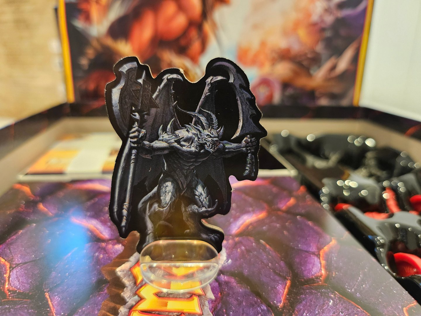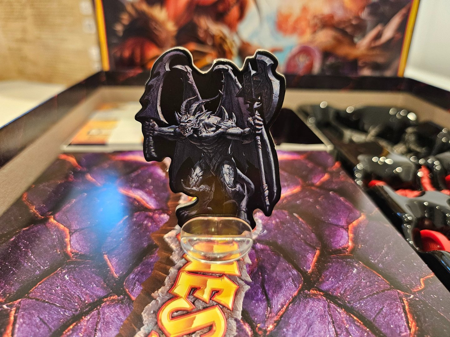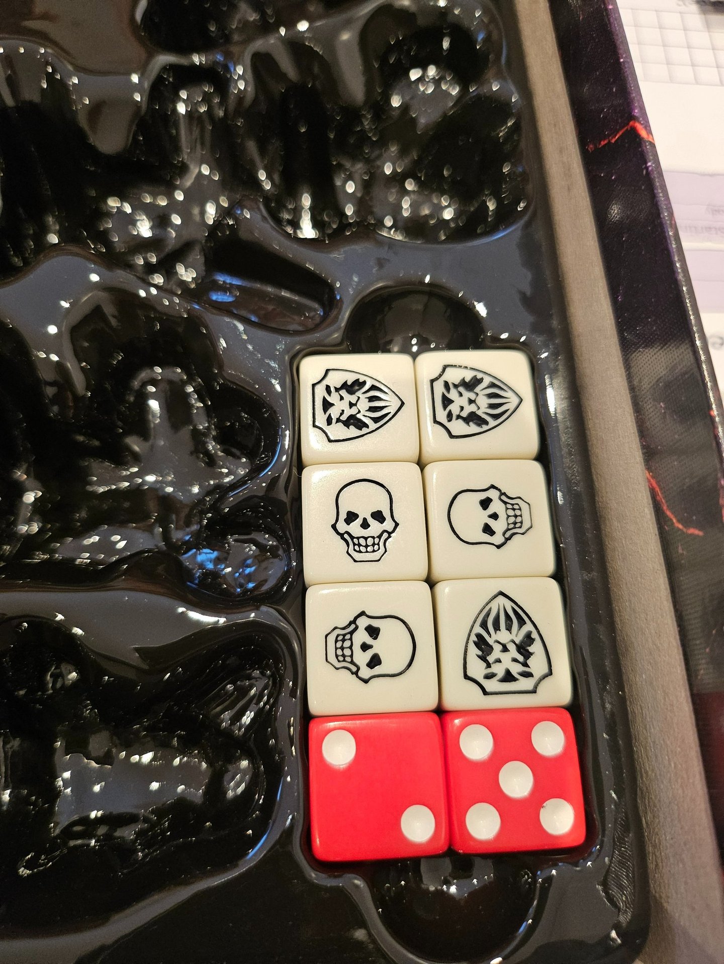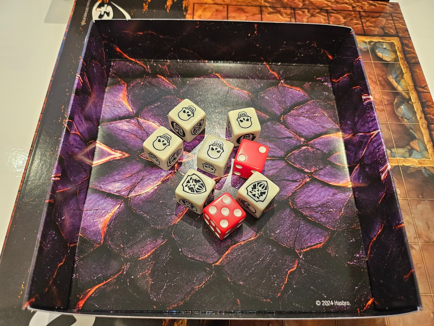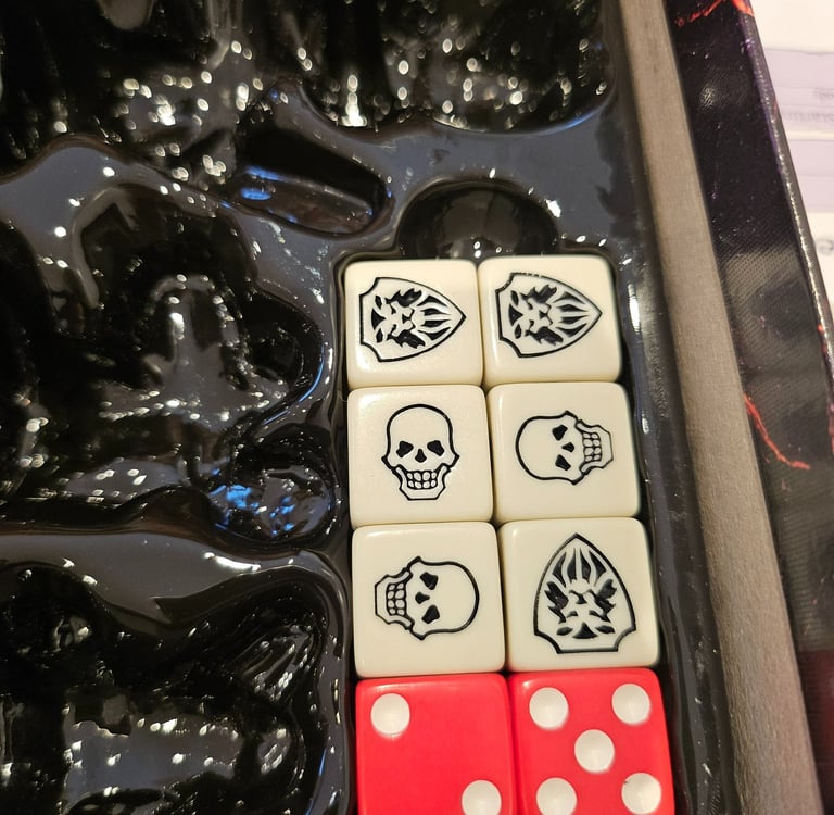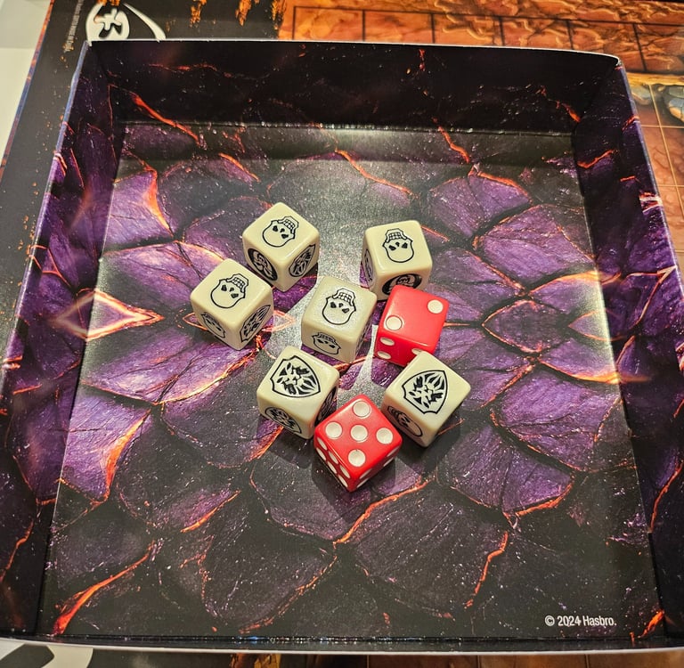 Después de sacar el tablero, nos encontramos el mazo de cartas, las bases de los standees, las miniaturas, los dados, y una caja de cartón que al darle la vuelta se convierte en un tiradados. Los dados tienen un color mas hueso que los blancos normales que venian con la caja base.