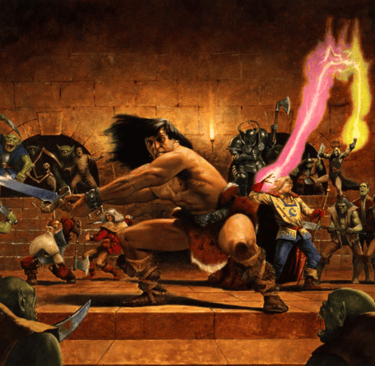 LE: Initially the client wanted a kind of mash-up of all the characters, with each one being given equal prominence. I was pretty sure that would just be a mess and I was determined that the barbarian should be front and center. Once I produced my initial sketch they went with the idea and from then on I was allowed the freedom to come up with my own compositions. The miniatures had already been designed so the look of each character was already set and had to be represented reasonably accurately in the painting. I was given a set for reference and tried to stick to the design. It would have been terrible if someone opened the box to find the miniatures didn’t look like what was on the box top. I had once been given a tour of the Games Workshop studios so I was familiar with the fantastic work of the figure sculptors and I wanted to do them justice.